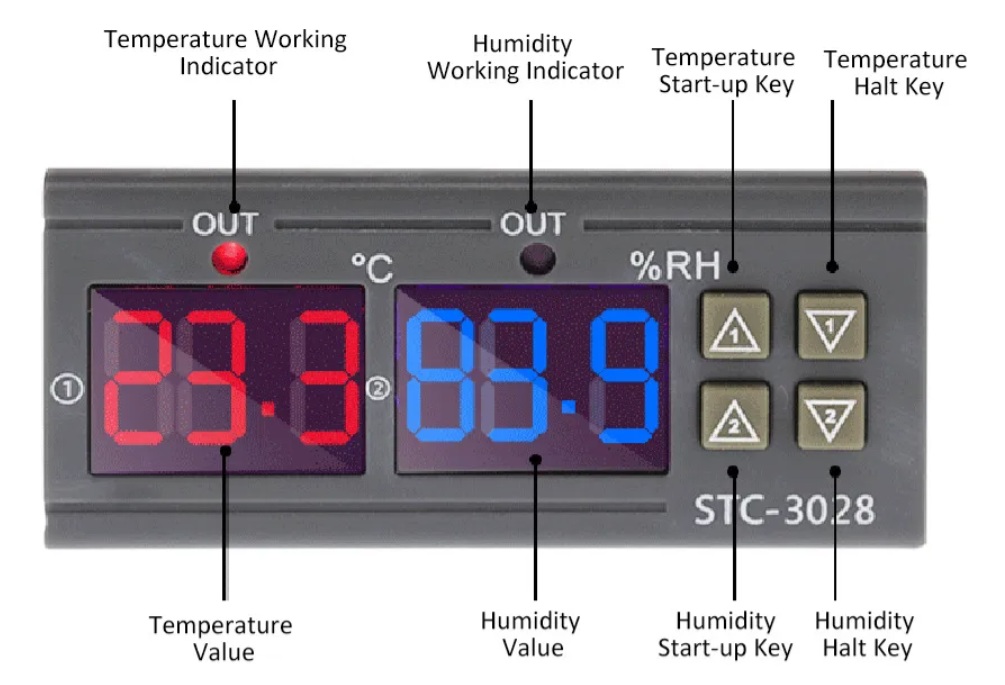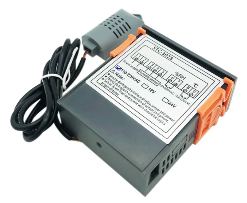 El STC-3028 es un controlador digital dual de alta precisión diseñado para gestionar simultáneamente la temperatura y la humedad. Es un dispositivo muy utilizado en proyectos de control ambiental debido a su capacidad de manejar simultáneamente dos salidas independientes y de sus 4 modos de operación (calefacción/refrigeración/humidificación/deshumidificación).  Funciona con 220VAC.