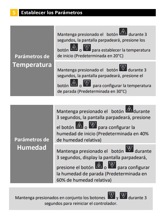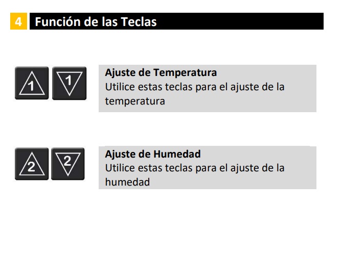 • Botones de control: Posee cuatro botones (dos a la izquierda para temperatura y dos a la derecha para humedad) que permiten establecer los puntos de inicio y parada de forma independiente.